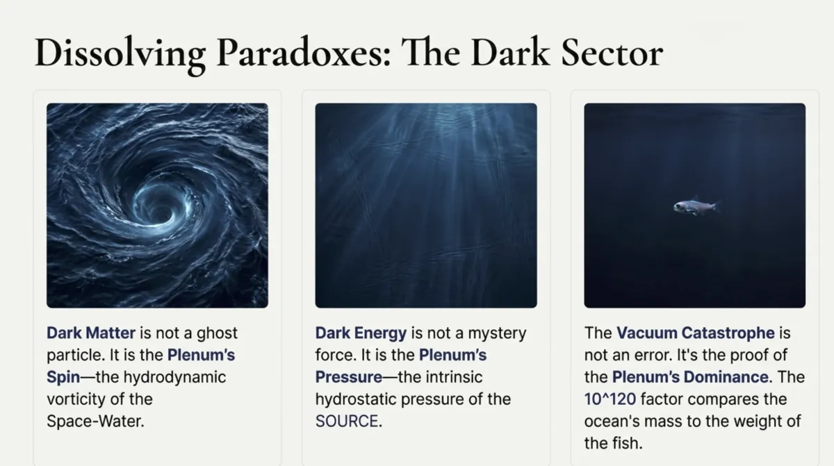 This shift dissolves many of the paradoxes in modern physics: dark matter, dark energy, quantum entanglement, galaxy formation (yes, even the Big Bang), expansion, Asymmetry, and the so-called “Vacuum Catastrophe.” Which is neither. It isn't a "Vacuum" nor a "Catastrophe." Why? Because “empty” space isn't. It is a quantum-like ocean filled with high-energy pure-potential—HEPP. Zero-point energy confirms this.