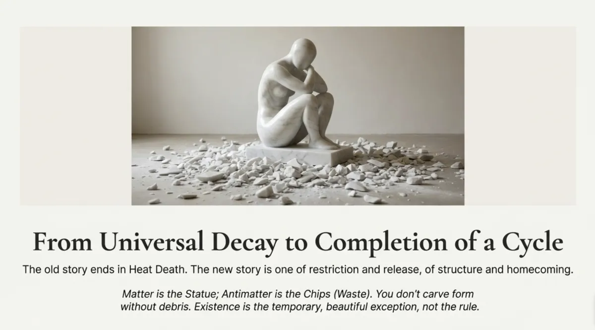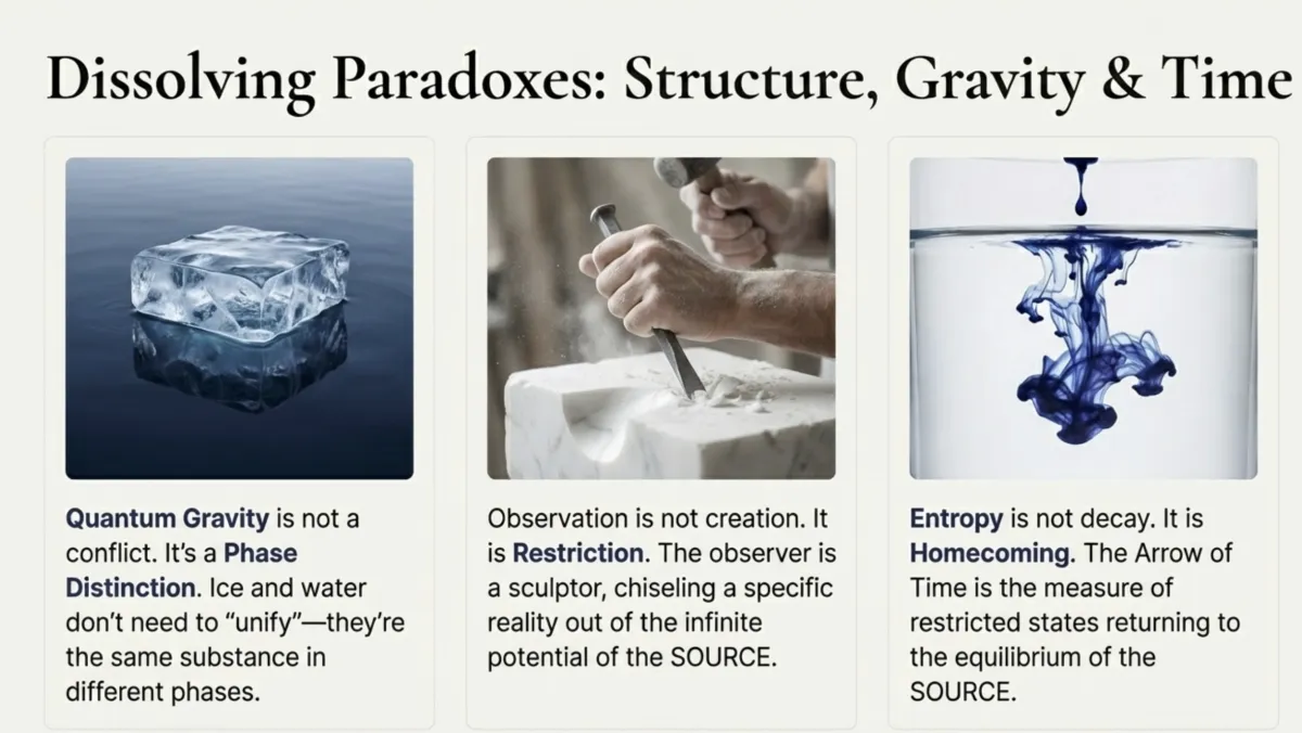 The arrow of time and entropy are corrected. Right now, entropy is defined as “1” (matter) moving toward disorder, decay, or “heat death”—a migration into chaos. Flip the frame and entropy becomes this: 0 (Source) —> 1 (Matter, Splinter, Wave) —> 0 (Return to Source).