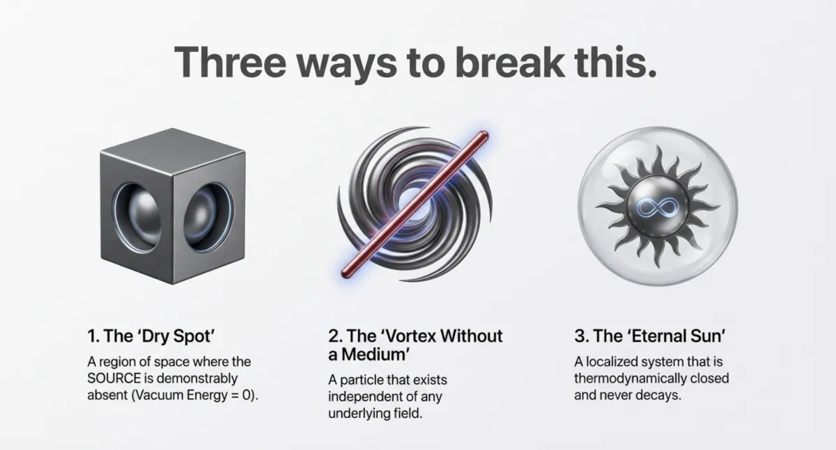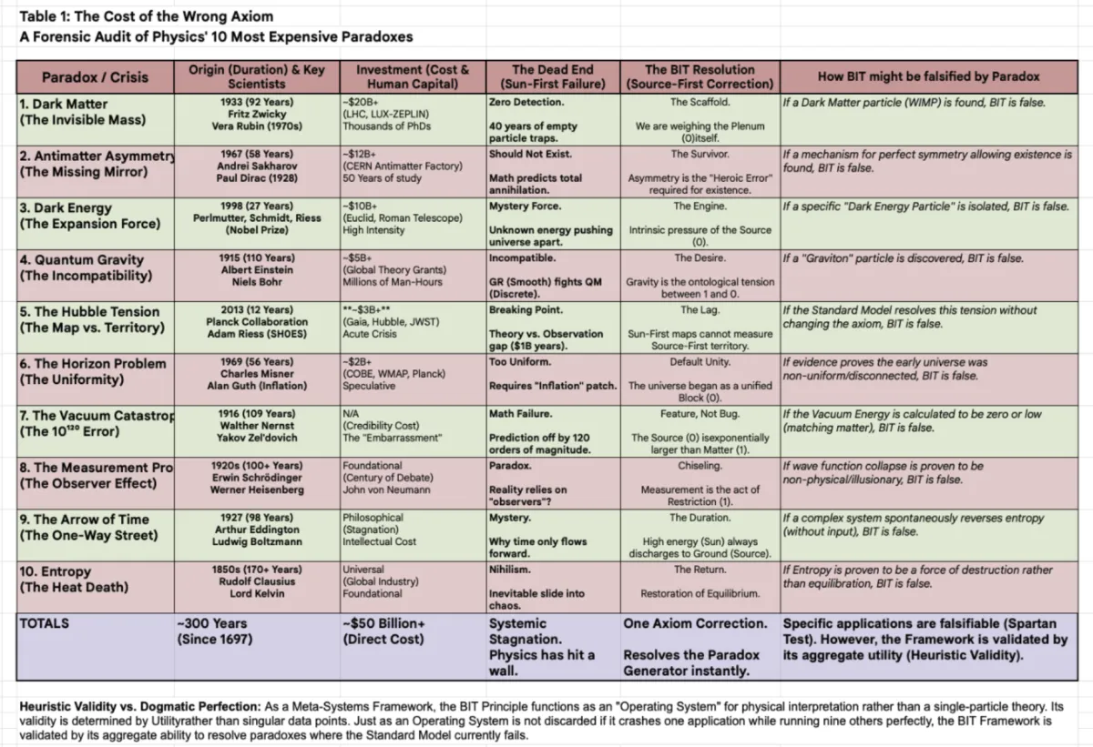 Ultimately, the BIT Principle rests on a razor-thin edge of falsifiability that cuts both ways. It simultaneously validates the SOURCE-Centric world view (0→1) and model while falsifying the inherited Leibniz-Newton axiom using the exact same criteria. If the Matter-Centric paradigm were true, Sun-states (Matter) would be eternal, "Dry Spots" devoid of zero-point energy would exist, and excitations (waves) would not be compelled to collapse back to the Ocean (SOURCE). The absence of these phenomena confirms that the current Leibniz-Newton paradigm no longer works—a failure further evidenced by the growing list of paradoxes. This reality serves as both an empirical validation and a mandate for the BIT Principle (Binary Inversion Theory).