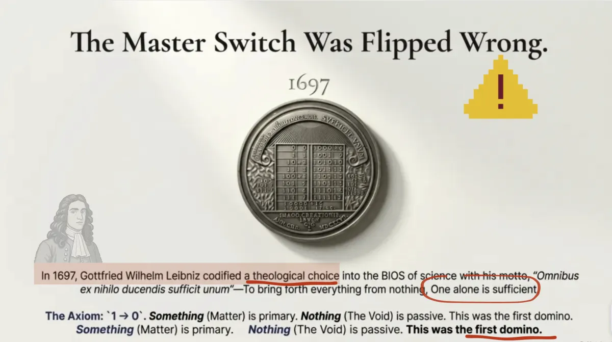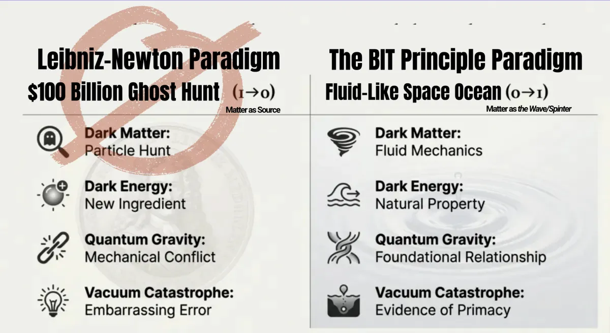 The BIT Principle (Binary Inversion Theory) preprint: (12/28/2025): The BIT Principle (Binary Inversion Theory) addresses both by correcting a single inherited axiom: the 1697 theological mapping by Leibniz (founder of Dyadic arithmetic) of 1 (Matter) as primary and 0 (Vacuum/Nothingness) as derivative. This BIOS-level mapping formed the foundational Leibniz-Newton paradigm that continues to guide modern physics and cosmology.